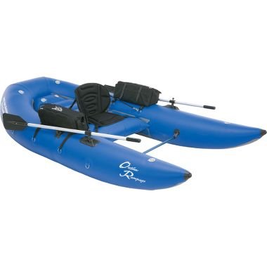 Imagine a fullsize pontoon boat with a classV whitewater rating and 1,300lb. capacity that weighs less than 40 lbs. and fits into an airlinespecific 32"L x 12"W x 20"H roller duffel. ImpossibleThats what they told Dave Scadden. He took it as a challenge and created the Rampage. Engineered with specific size, shape, capacity and performance goals in mind, this frameless pontoon defines a new standard of what is possible. Remove it from the included roller duffel bag, use a 12volt pump to fully inflate the boat in less than two minutes and youre ready to go fishing. Weighing less than half the weight of a framed pontoon with the same level of performance, the Rampage maneuvers like a sports car on the water. Effortless to row, it swims circles around framed boats, knifes through whitewater and easily tames fourfoot whitecaps. Patented Unitrac bladderless pontoons with five air chambers create a platform that is twice as rigid as a framed double pontoon boat. Dont forget the fact that the whole boat can be lifted with just one hand. Comes with two 6ft., twopiece oars. Manufacturers lifetime warranty.Weight: 38 lbs.Weight capacity: 1,300 lbs.