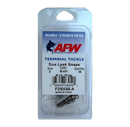 These Duo Lock Snaps can be used anytime you are casting or trolling with true-running crankbaits or spoons and are repeatedly changing lures. American Fishing Wires Duo Lock Snaps are made of high tensile strength wire with a black oxidized finish. Duo Lock Snaps can be fitted to wire monofilament and other various lines. A burr-free nonabrasive finish combined with high strength and corrosion resistance make AFWs Duo Lock Snaps the preferred choice of professional anglers around the world.