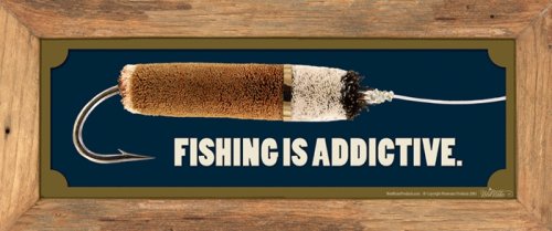 This poster features a larger-than-life image an imaginative, hand-tied cigarette butt fly. The caption playfully reads "Fishing Is Addictive." A fun and unique gift for any fisherman or fisherwoman. Size: 23" x 9"